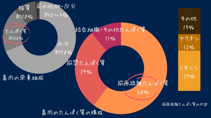 およそ20%のたんぱく質は3種類のたんぱく質に分類され、収縮などの運動に関わる筋原線維たんぱく質がおよそ6割、繊維のあいだを満たす液状の筋漿たんぱく質(筋形質たんぱく質)がおよそ3割、それらを包み込む膜状、あるいは腱状の結合組織たんぱく質(肉基質たんぱく質)がおよそ1割で構成されています。