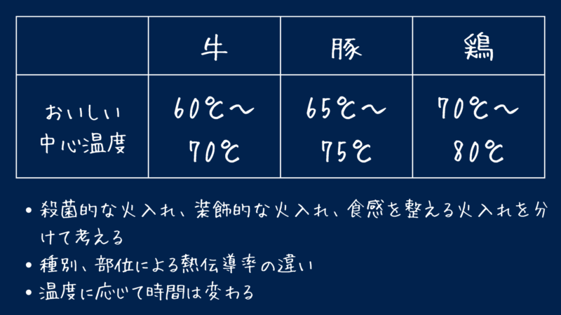 温度と時間の変化と共に、肉の内部はどのように変化していくのかを言葉にすると、次のようになります。