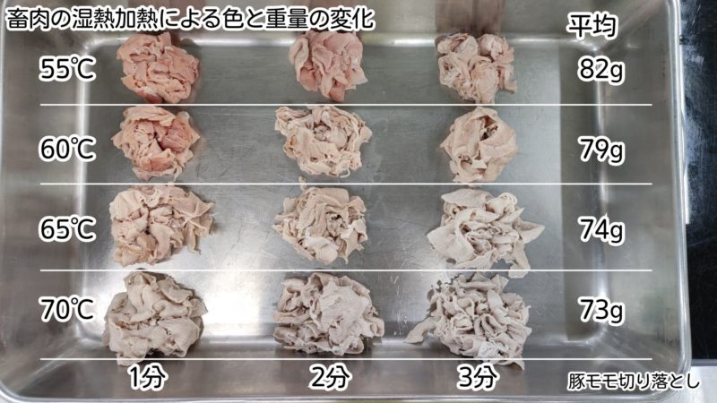 その直後、56℃付近からはミオグロビン・ミオゲンなどの水溶性の筋漿たんぱく質が網目構造に粘りつくように凝固しはじめ、70℃辺りまでに薄いピンク色から灰褐色へと変化していきます。