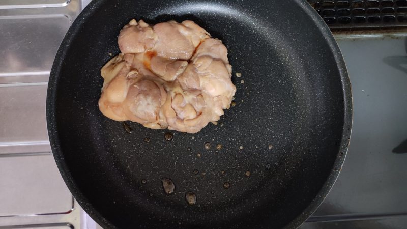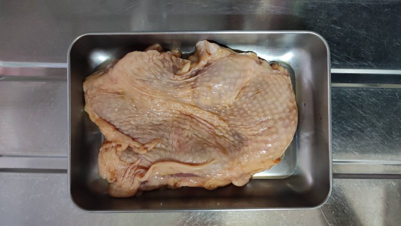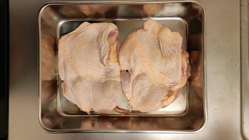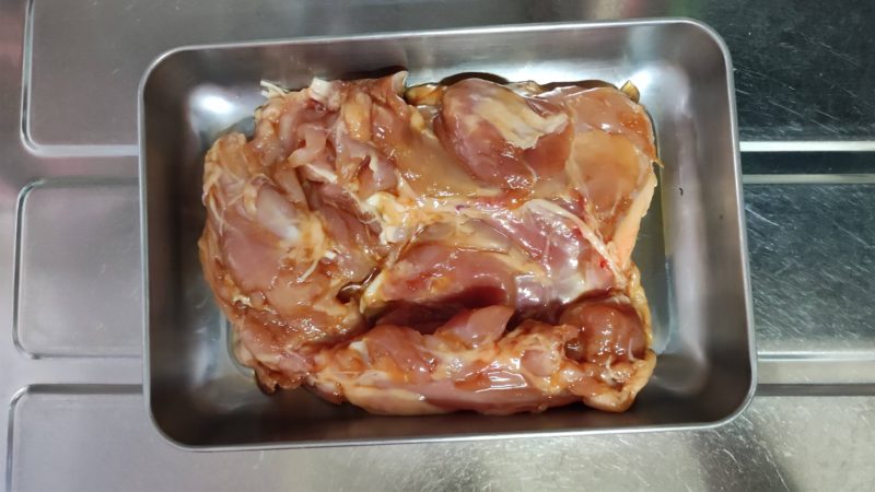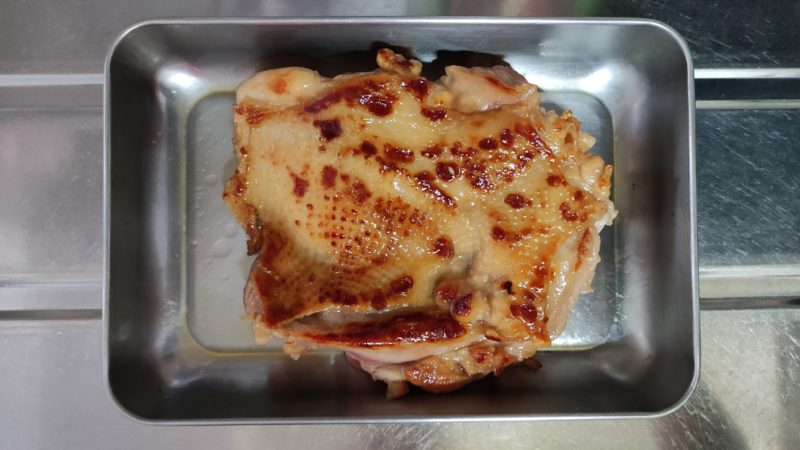 大まかには、鶏もも肉を真空(減圧)下でマリネし、フライパンで表層を焼き付けてから真空低温調理で加熱します。