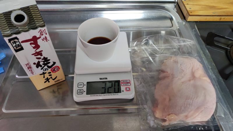 鶏もも肉を真空袋に入れ、おもさの10%に相当する調味液を投入します。