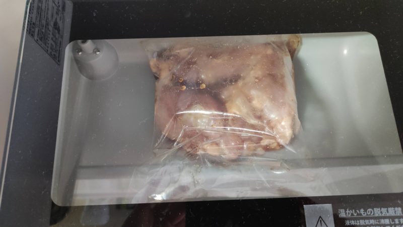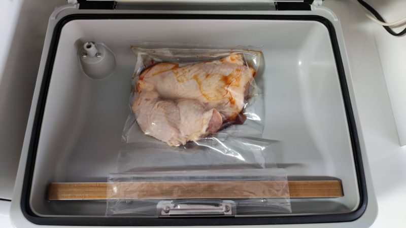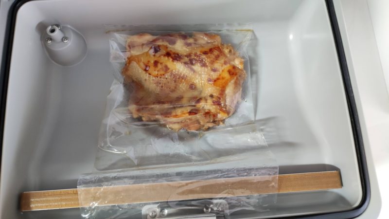 焼き色をつけて冷ました鶏もも肉を真空袋に戻し、真空パックします。
